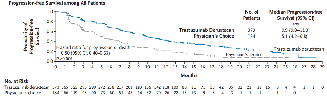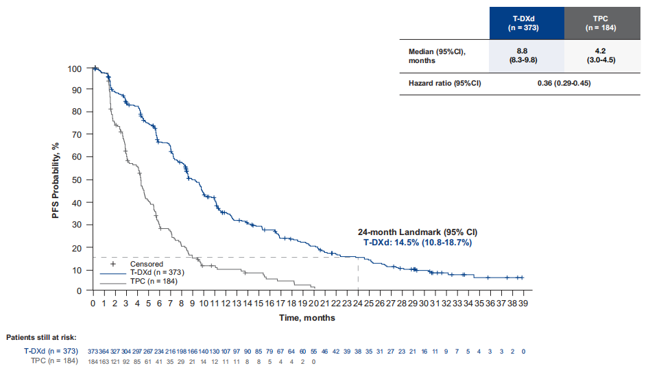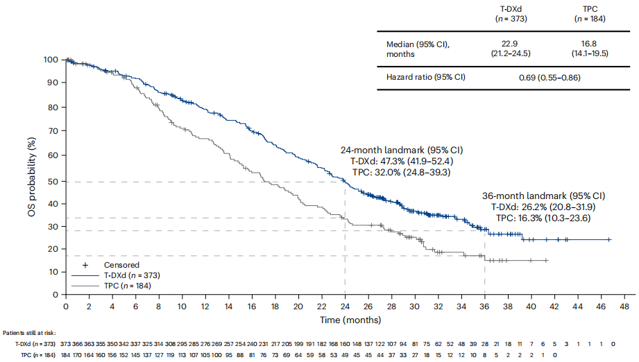 Additionally, long-term follow-up data have been published in the DB04 study, with a median follow-up of 32.0 months (as of March 1, 2023). Among the entire population, the median progression-free survival (mPFS) for the T-DXd group and the TPC group were 8.8 months and 4.2 months, respectively (hazard ratio, HR=0.36), and the median overall survival (mOS) was 22.9 months and 16.8 months, respectively (HR=0.69). These results reaffirm the superior efficacy and long-term survival benefits of T-DXd in HER2-low advanced breast cancer (refer to Figures 4–5)[6].