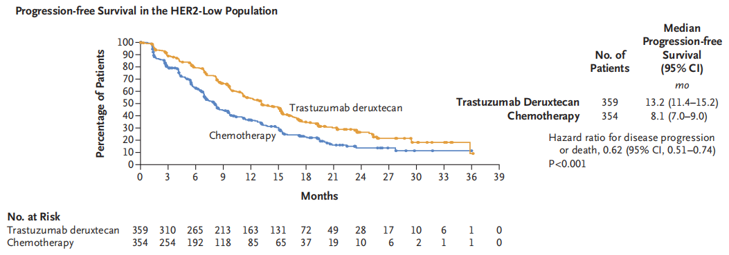 Trastuzumab Deruxtecan (T-DXd), a new generation of ADC drugs, has demonstrated potential therapeutic effects on HER2 low tumors in preclinical studies. The DESTINY-Breast 04 study, the first Phase III clinical trial to confirm the efficacy of T-DXd in the HER2 low population, enrolled 557 patients with unresectable/metastatic breast cancer in the HER2 low category who had previously undergone first-line or second-line chemotherapy. These patients were randomly assigned to either the T-DXd group or the physician's choice of chemotherapy group (TPC, such as Capecitabine, Eribulin, Gemcitabine, Paclitaxel, or albumin Paclitaxel) [1]. The results indicated that with a median follow-up of 18.4 months (data as of January 11, 2022), the median progression-free survival (mPFS) in the T-DXd group was significantly longer by 4.8 months (9.9 months vs 5.1 months, HR=0.50), and the median overall survival (mOS) was significantly longer by 6.6 months (23.4 months vs 16.8 months, HR=0.64) in the overall population compared to the TPC group (Figures 2 and 3) [1]. Based on these study results, T-DXd was approved by the US FDA in August 2022 for use in patients with unresectable or metastatic HER2 low breast cancer who have not responded to medical treatment. T-DXd was also approved by the NMPA China in July 2023 for use in adult patients with unresectable or metastatic HER2 low breast cancer who have previously received at least one systemic treatment in the metastatic disease phase, or who relapsed during adjuvant chemotherapy or within 6 months after completing adjuvant chemotherapy.