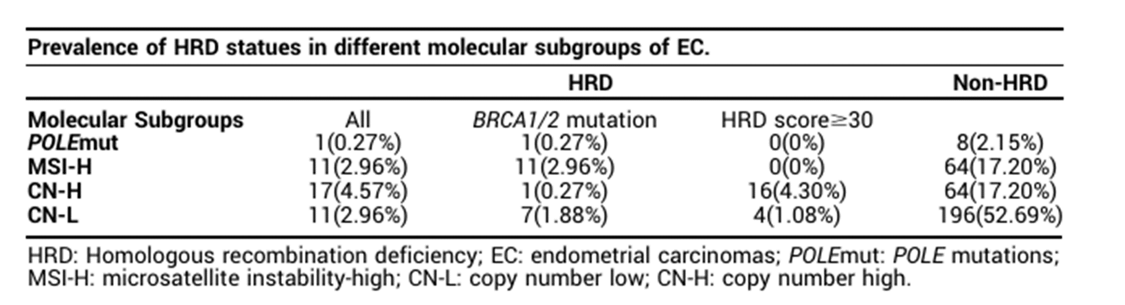 Table 1. Distribution of HRD status among different molecular subtypes in patients with endometrial cancer