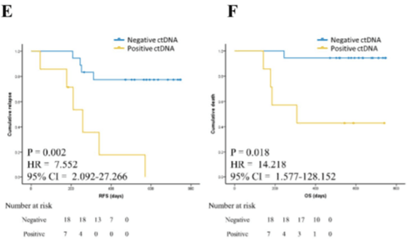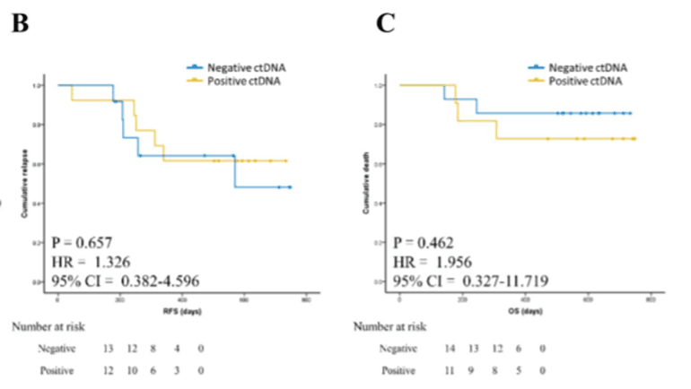 NCT02965391研究在手术前即刻(时间A)和肿瘤切除后多个预先指定的时间点[时间B(5分钟)、时间C(30分钟)和时间D(2小时)]和手术后[时间P1(1天)、时间P2(3天)和时间P3(1个月)]获得10毫升血浆样品。肿瘤根治术后ctDNA迅速衰减。在术后1天时MRD阳性和阴性患者的平均RFS和平均OS都无显著差异;而在术后3天和术后1个月时MRD阳性和阴性患者的RFS和OS存在显著差异。提示术后3天和术后1个月的MRD检测结果与患者的肿瘤复发和生存更为相关。