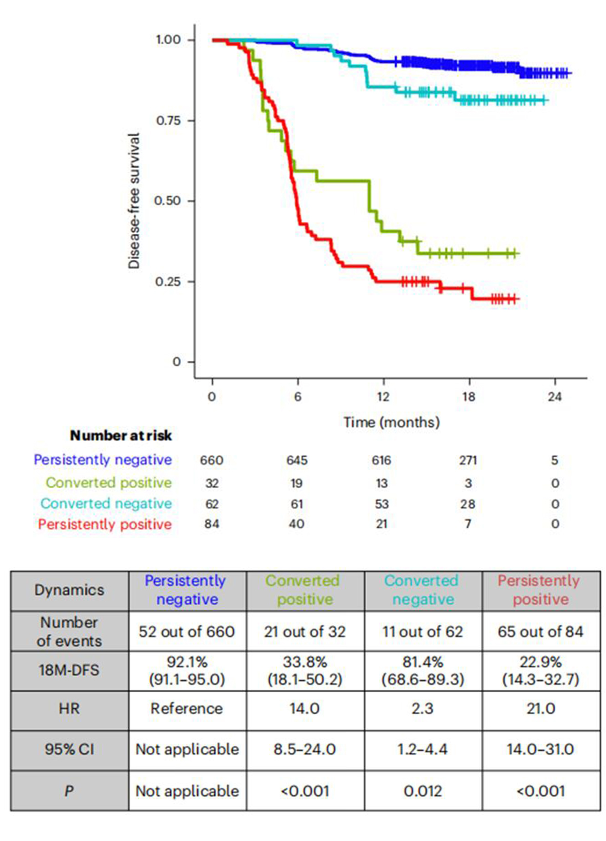 在CIRCULATE-Japan研究中,研究者根据结直肠癌患者术后4周和12周的MRD检测结果,将患者分为持续阳性、阳性转阴性、阴性转阳性、持续阴性性四组,结果表明“阳性转阴性”组的DFS较“阳性转阳性”组有显著提升(81.4%vs33.8%)。再次强调了长期监控的重要性。