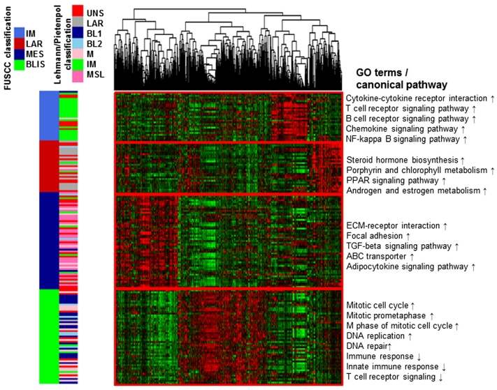 随着研究发现,长链非编码RNA(lncRNA)是乳腺癌发生发展过程中一种重要的调控因子,其特异性表达导致乳腺癌侵袭性加强,且越来越多的证据表明与预后相关。虽然TNBC分型体系已经有Lehmann分型和Burstein分型,但这些分型体系均未将lncRNA作为分型标志物纳入其中。考虑到lncRNA在肿瘤发生发展过程中的重要作用,中国复旦大学附属肿瘤医院乳腺肿瘤多学科诊疗团队整合了mRNA和lncRNA表达谱,通过微阵列测序技术开发出一种新的TNBC分型——复旦四分型,即上述的BLIS、IM、MES和LAR。BLIS亚型的特征是下调免疫应答基因,激活细胞周期和DNA修复;IM亚型具有高表达的免疫细胞信号基因和细胞因子信号基因;MES亚型富含生长因子信号通路;LAR亚型以雄激素受体信号通路为特征[5~6](图1)。