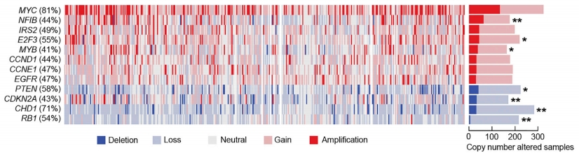 复旦大学附属肿瘤医院乳腺肿瘤多学科诊疗团队利用高通量测序技术,在国际上首次绘制出最大规模的TNBC基因组图谱。通过分析全外显子组测序(WES)和拷贝数改变(CNA)数据,发现最常见的基因突变是TP53(74%),其次是PIK3CA(18%);最常见拷贝数扩增的基因是MYC(81%),其次是E2F3(55%);最常见拷贝数缺失的基因是CHD1(71%),其次是PTEN(58%)[7](图2、图3)。