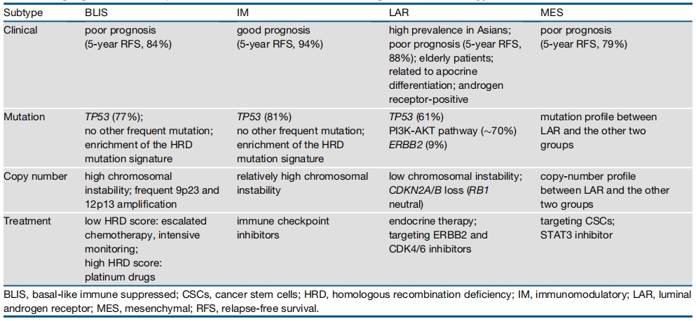 图4 TNBC亚型的基因组学和潜在的治疗策略