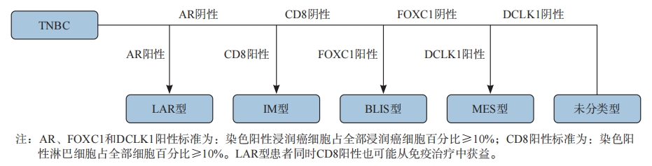 为了让“复旦分型”能够方便、快捷的应用于TNBC患者的临床诊疗,复旦大学附属肿瘤医院乳腺肿瘤多学科诊疗团队设计了一种基于免疫组化(IHC)的TNBC分子分型方法。通过IHC技术检测亚型特异性标志物来代替转录组学和基因组学检测技术是一种可行的方法,且在乳腺癌中已有成功的先例(乳腺癌分子分型)。最终确定AR、CD8、FOXC1和DCLK1作为TNBC亚型的特异性标志物以准确区分各个亚型,其分型流程见图5[8~9]: