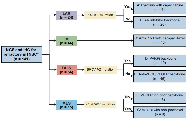 结合TNBC分型分析:BLS亚型具有基因组高度不稳定特征,BRCA基因突变与之相关,提示该亚型患者可使用铂类或PARP抑制剂等靶向DNA损伤类药物治疗。BLS亚型还可根据HRD评分分为两个亚组,HRD评分高的患者预后较好,并可能受益于靶向DNA损伤类药物;而HRD评分低的患者预后较差,目前仅推荐参加临床试验。IM亚型免疫细胞富集,常见PD1、PDL1、CTLA4和IDO1的表达水平升高,提示该亚型患者可能受益于免疫检查点抑制剂。MES亚型无明显的基因组改变,但常见STAT3信号通路激活和表达,提示该亚型患者可能受益于抗肿瘤干细胞和抗血管生成抑制剂。LAR亚型富含HER2基因和PIK3CA基因突变以及CDKN2A/B拷贝数缺失,提示该亚型患者可能对HER2抑制剂、PI3K和AKT抑制剂、CDK4/6抑制剂等靶向治疗敏感[7](图4)。