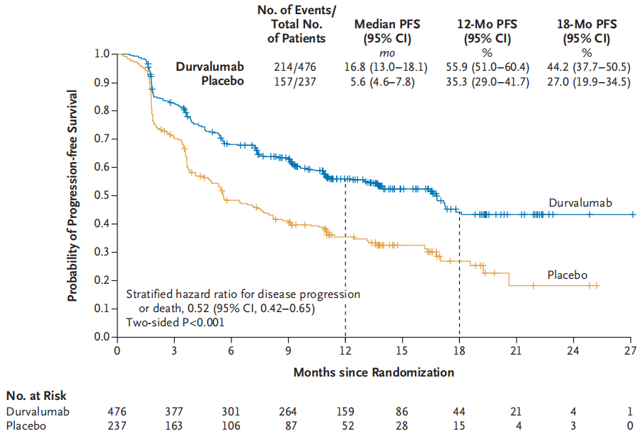 Durvalumab 作为巩固治疗在未进展的局限期小细胞肺癌患者中显著改善了总生存期和无进展生存期,且安全性可控。这些结果为局限期小细胞肺癌的治疗提供了新的标准,即在同步放化疗后使用 Durvalumab 进行巩固治疗。