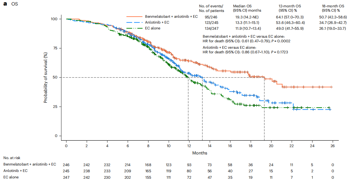 ETER701 研究[5]是一项多中心、双盲、随机、安慰剂对照的 III 期临床试验,旨在评估贝莫苏拜单抗与安罗替尼联合标准依托泊苷和卡铂化疗(EP 方案)治疗广泛期小细胞肺癌(ES-SCLC)患者的疗效和安全性。共纳入 738 名初次治疗的 ES-SCLC 患者。