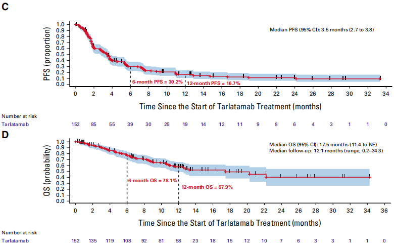 2024 年 5 月 16 日,塔拉妥单抗(针对 DLL3 与 CD3 的双特异性 T 细胞衔接蛋白)被 FDA 加速批准用于广泛期小细胞肺癌二线治疗。DeLLphi-300 研究用于复发或难治性小细胞肺癌(SCLC)的安全性、耐受性以及疗效。共有 152 名患者接受了 ≥10mg 的 tarlatamab 治疗,中位随访时间为 12.1 个月[6]。结果显示(图5),塔拉妥单抗对小细胞肺癌脑转移患者有效率为 35.3%,中位 PFS 与 OS 分别为 3.5 个月与 17.5 个月,既往颅脑放疗患者疗效更佳,但入组患者数量少,结果缺乏说服力,且存在 CRS、ICANS 等毒副反应处理问题。