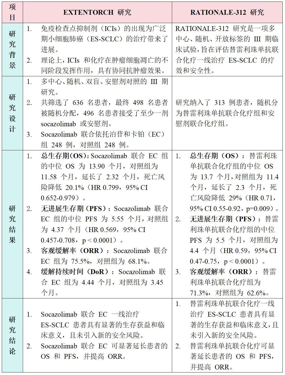 2024 年发表的 EXTENTORCH 研究与 RATIONALE-312 研究[3]两项研究均表明免疫联合化疗一线治疗 ES-SCLC 患者具有显著的生存获益和临床意义(表2,图2)。