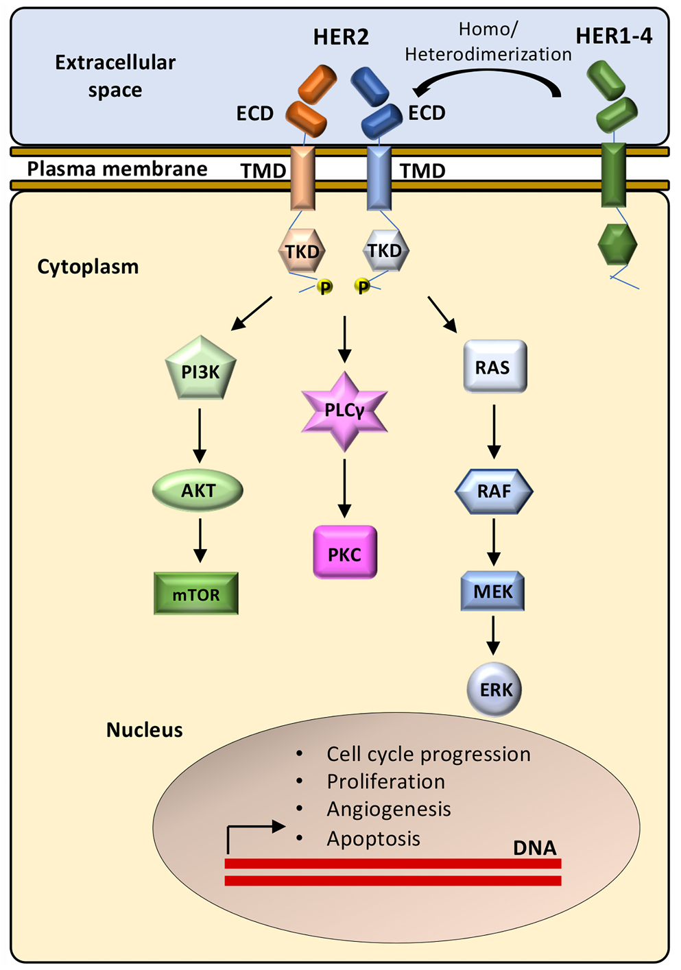 HER2是由ERBB2(erb-b2 receptor tyrosine kinase 2,Entrez ID:2064)基因编码的跨膜糖蛋白,基因位于17号染色体的短臂上。在结构上,它由三个区域组成:细胞外结构域(ECD),疏水性跨膜结构域(TMD),以及由近膜结构域(JMD)和酪氨酸激酶结构域(TKD)组成的细胞内部分[1-2]。ERBB2(HER2)属于表皮生长因子受体家族,家族成员包括EGFR、ERBB3和ERBB4。HER2蛋白没有自己的配体结合结构域,因此不能结合生长因子。它通过与家族其他成员结合形成异二聚体,激活下游信号通路,包括MAPK和PI3K/AKT/mTOR信号级联反应。HER2还可以同源二聚化并启动MAPK、SRC、PI3K和STAT信号转导。HER2介导的信号转导激活最终导致细胞增殖、迁移和分化[2-3]。