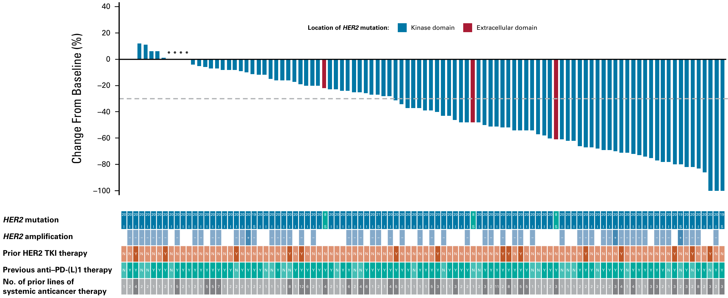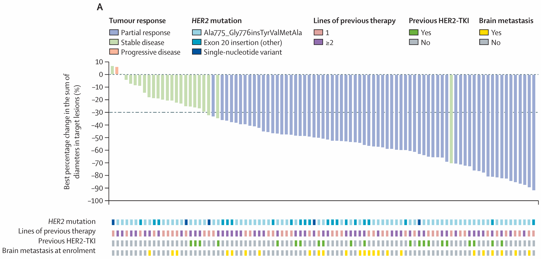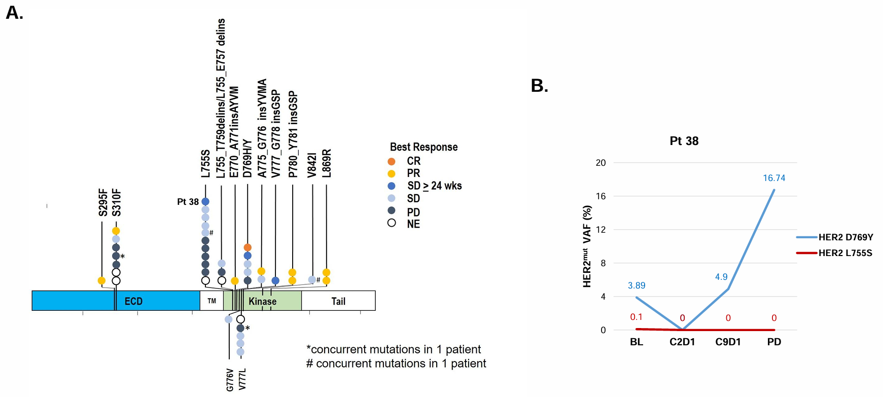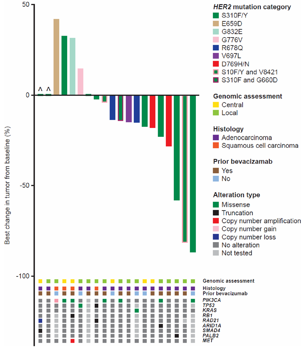 患者接受泛HER酪氨酸激酶抑制剂奈拉替尼治疗,主要终点为ORR,次要终点包括DOR、CBR、PFS和安全性。4例患者确认部分缓解,ORR为18.2%,6例病情稳定≥16周,CBR为45.5%。中位DOR为7.6个月,中位PFS为5.1个月。携带S310F/Y单一突变的患者中,30%(3/10)观察到客观反应。在多种HER2突变类型中观察到疾病稳定,包括2例激酶结构域突变(D769H/N)患者和2例跨膜结构域突变(V697L、R678Q)患者。PIK3CA共突变似乎并不排斥对奈拉替尼的应答。研究还发现ctDNA的复阳与临床进展同时发生[8]。
