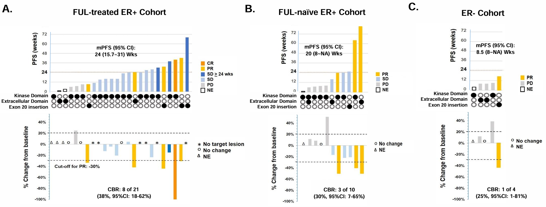 57例N+F+T治疗患者的研究者评估的ORR为39%,包括1例完全缓解(CR)和21例部分缓解(PR),CBR为54%,中位DOR为14.4个月,中位PFS为8.3个月。氟维司群或F+T治疗的患者无应答,交叉到N+F+T的患者有应答。在导管和小叶组织学、≥1个HER2突变,以及发生HER3等共突变的患者中观察到反应。激酶结构域V777L突变患者的ORR为63%(5/8),L755S为24%(4/17),其他错义突变患者的ORR为33%(3/9);外显子20插入突变患者的ORR为42%(5/12),细胞外结构域S310F突变患者的ORR为33%(1/3)。尽管携带L755S的患者ORR较低,但中位PFS达到15.1个月。80%(4/5)的HER2双激活突变患者有应答[6]。