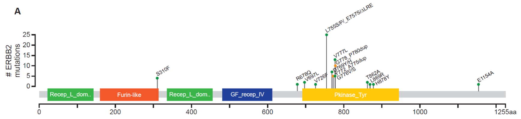 在无扩增或过表达的情况下,HER2基因体细胞激活突变存在于约2%的原发性乳腺癌,3%-5%的激素受体阳性(HR+)转移性乳腺癌(MBC)中,在小叶组织学患者中更常见(5%-8%)。HER2热点突变已被证实是致癌的,并且与不良预后相关。在MBC中,由于HER2和雌激素受体(ER)信号通路之间的干扰,HER2突变导致对内分泌治疗产生耐药性[6]。