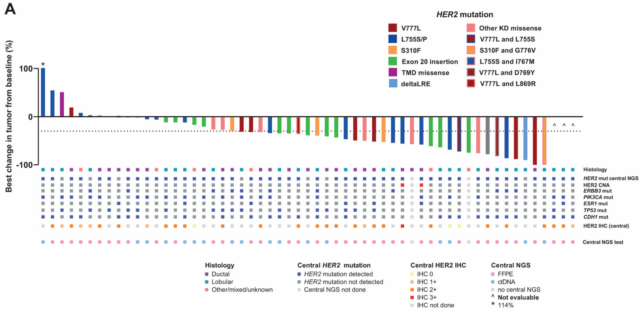 57例N+F+T治疗患者中,有48例中心NGS检测到HER2突变,ORR为42%;有6例患者有足够的样本,但未检测到HER2突变,这些患者均无应答。ERBB3、ESR1、CDH1共突变对ORR无影响,PIK3CA和TP53共突变患者的ORR有所降低(分别为21%和23%)。HER2-IHC或FISH状态与患者对N+F+T的应答无关。治疗后循环肿瘤DNA(ctDNA)复阳,以及继发HER2、TP53、PTEN和PIK3CA突变的患者出现进展。一例继发HER2 798I和PIK3CA突变的患者使用了PI3K抑制剂alpelisib治疗,达到PR[6]。