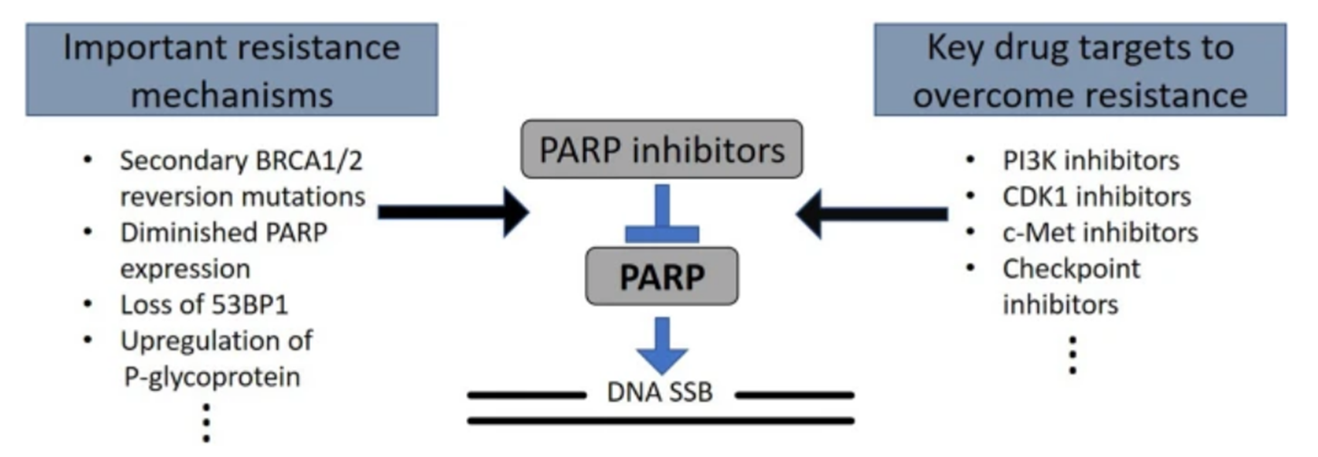 除了涉及p-糖蛋白的一般药物流出机制外,PARPi耐药性可能依赖于损害PARPi功效的其他潜在“可用药”因素。因此,如果可以避开耐药机制,PARPi敏感性可以通过联合治疗来恢复[6]。