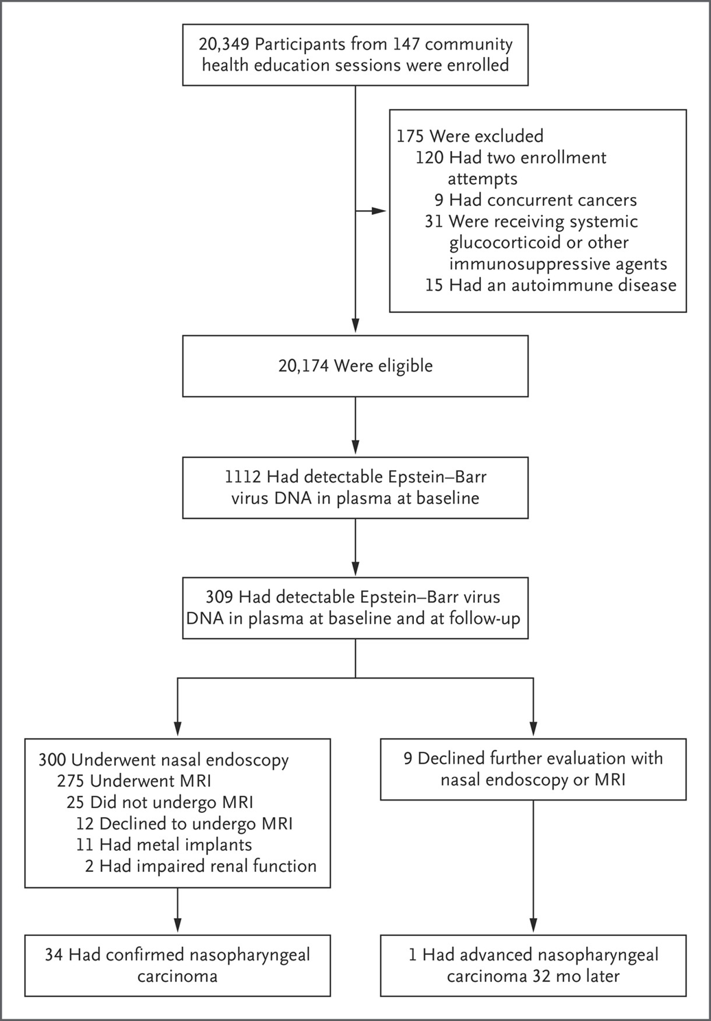 ▲图2.受试者入组、血浆中EBV-DNA 筛查以及通过鼻内镜和磁共振成像确认鼻咽癌流程图