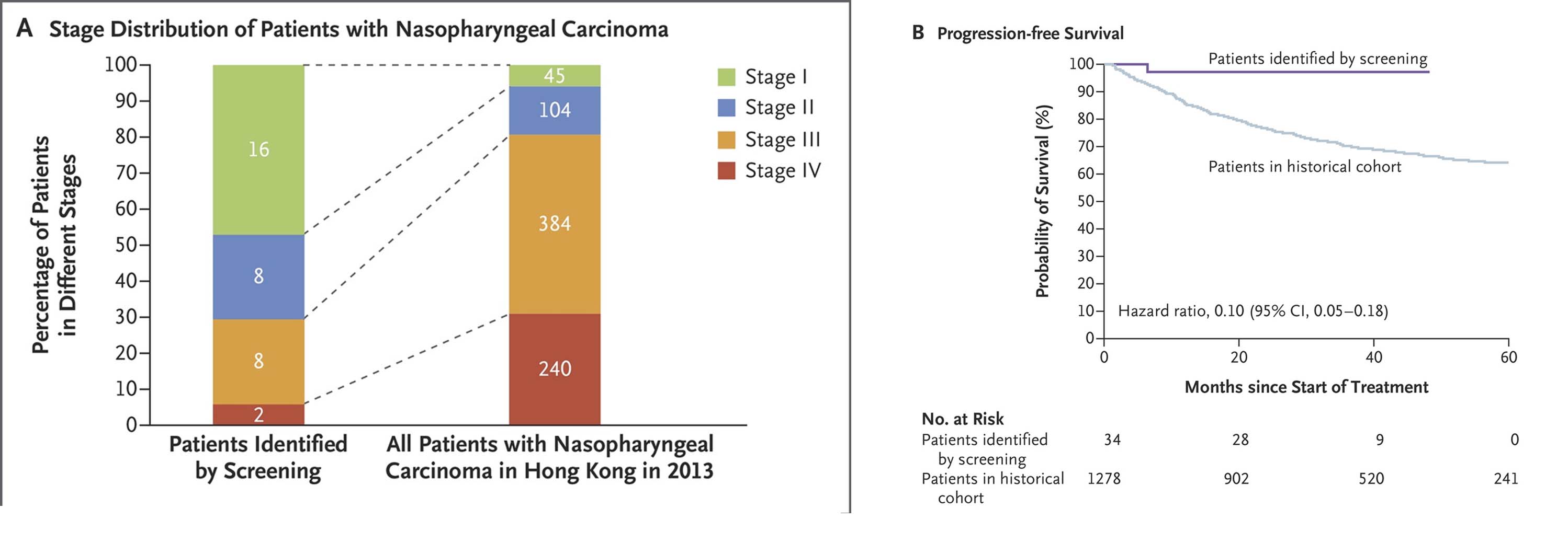 ▲图3. 通过筛查发现的鼻咽癌患者分期分布及无进展生存期与既往样本对比。
