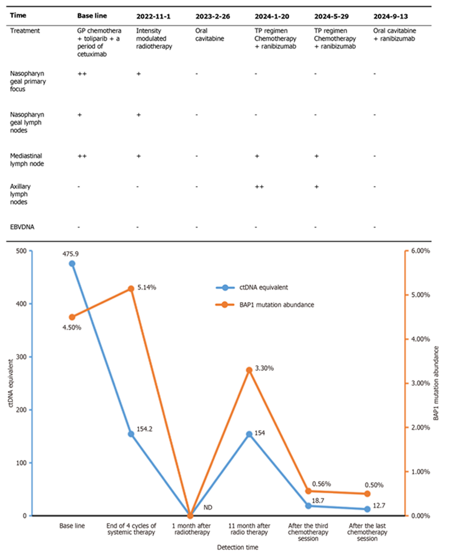 近期发表在《世界临床病例杂志》2025年的一篇案例,报道了一名EBV-DNA阴性但ctDNA阳性的晚期鼻咽癌患者,通过动态监测ctDNA水平,成功预警了疾病进展,并指导了放疗时机,最终实现良好治疗效果[3]。