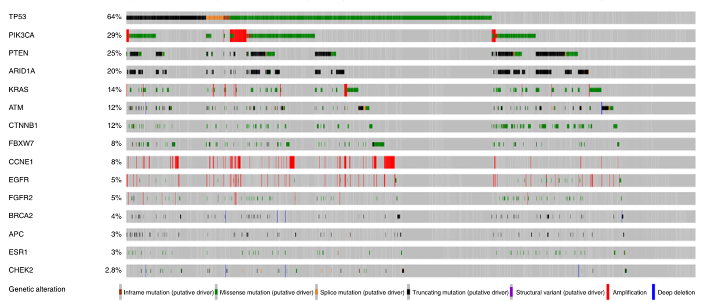 图1. 研究队列中子宫内膜癌患者常见基因突变图谱