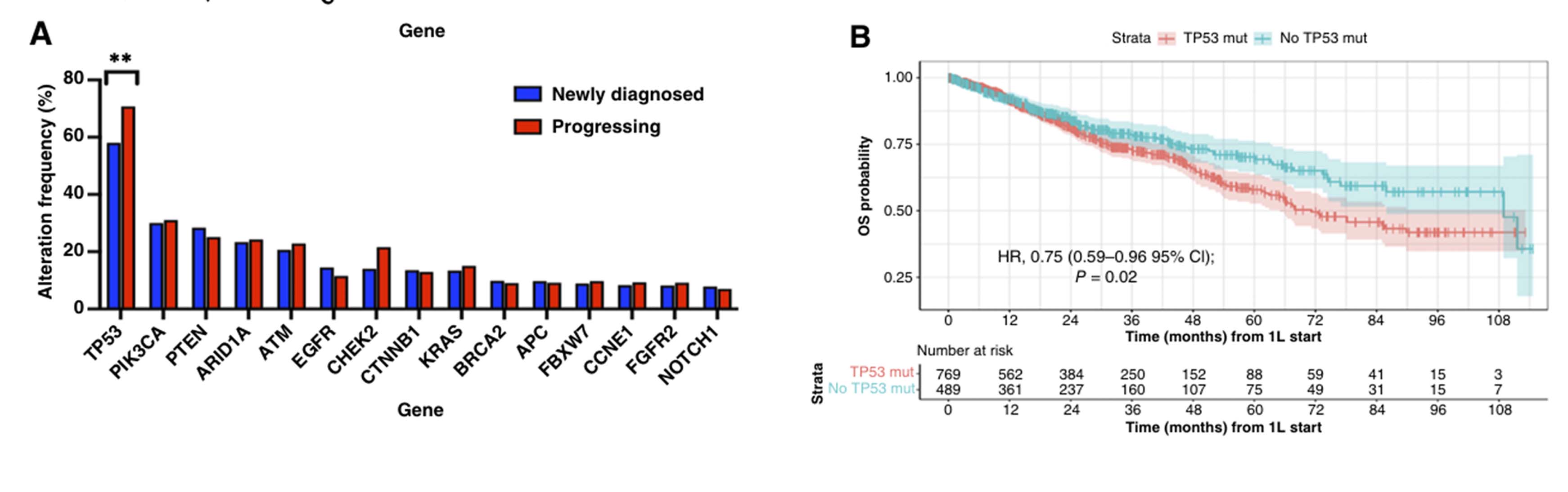 图2. A,TP53基因突变更显著分布在复发进展患者中;B,TP53突变与较低总生存期有关