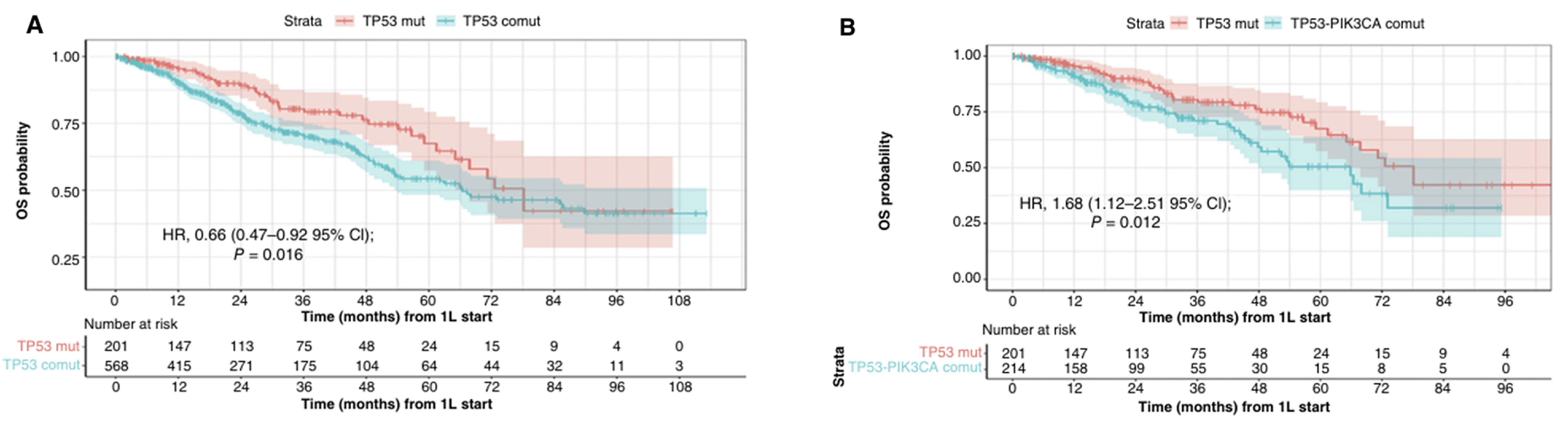研究发现 TP53 共突变状态对患者预后的影响更为显著。在 776 例 TP53 突变患者中,74% 存在至少一种共突变,这类患者的总生存期(66.4 个月)明显差于仅发生 TP53 单一突变的患者(78.1 个月,P=0.016)。其中,TP53 与 PIK3CA 共突变(P=0.012)的患者预后最差,成为临床需要重点关注的高危人群。