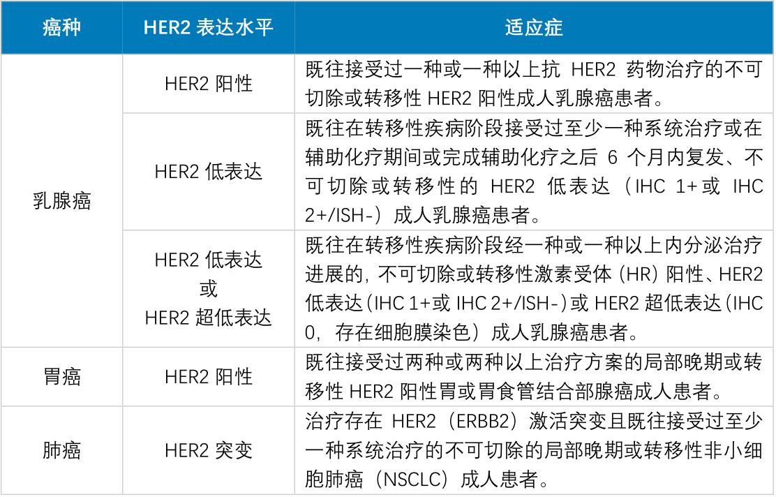 截至目前,德曲妥珠单抗在我国已经获批了五项适应症,分别在乳腺癌、肺癌及胃癌中批准使用[2]。