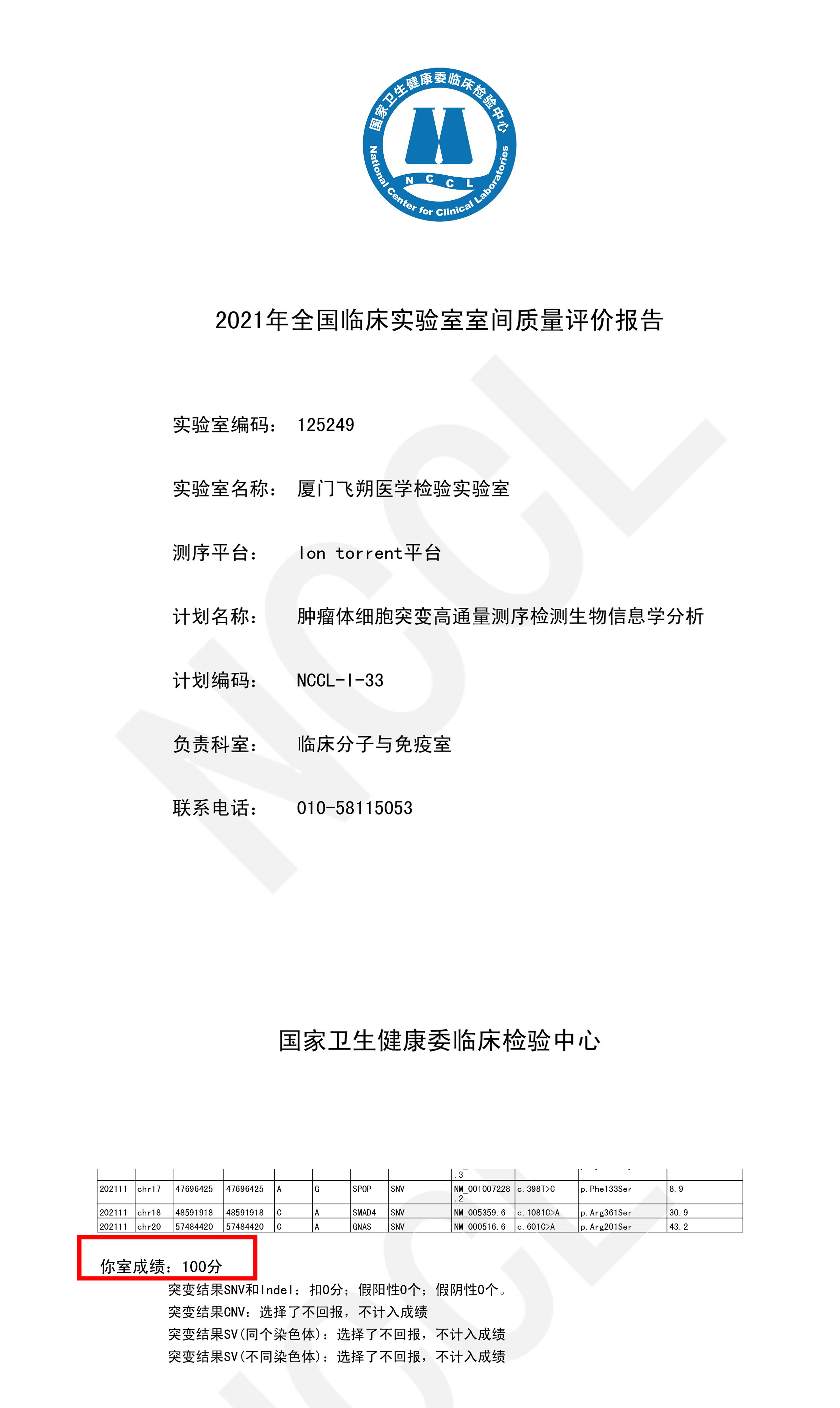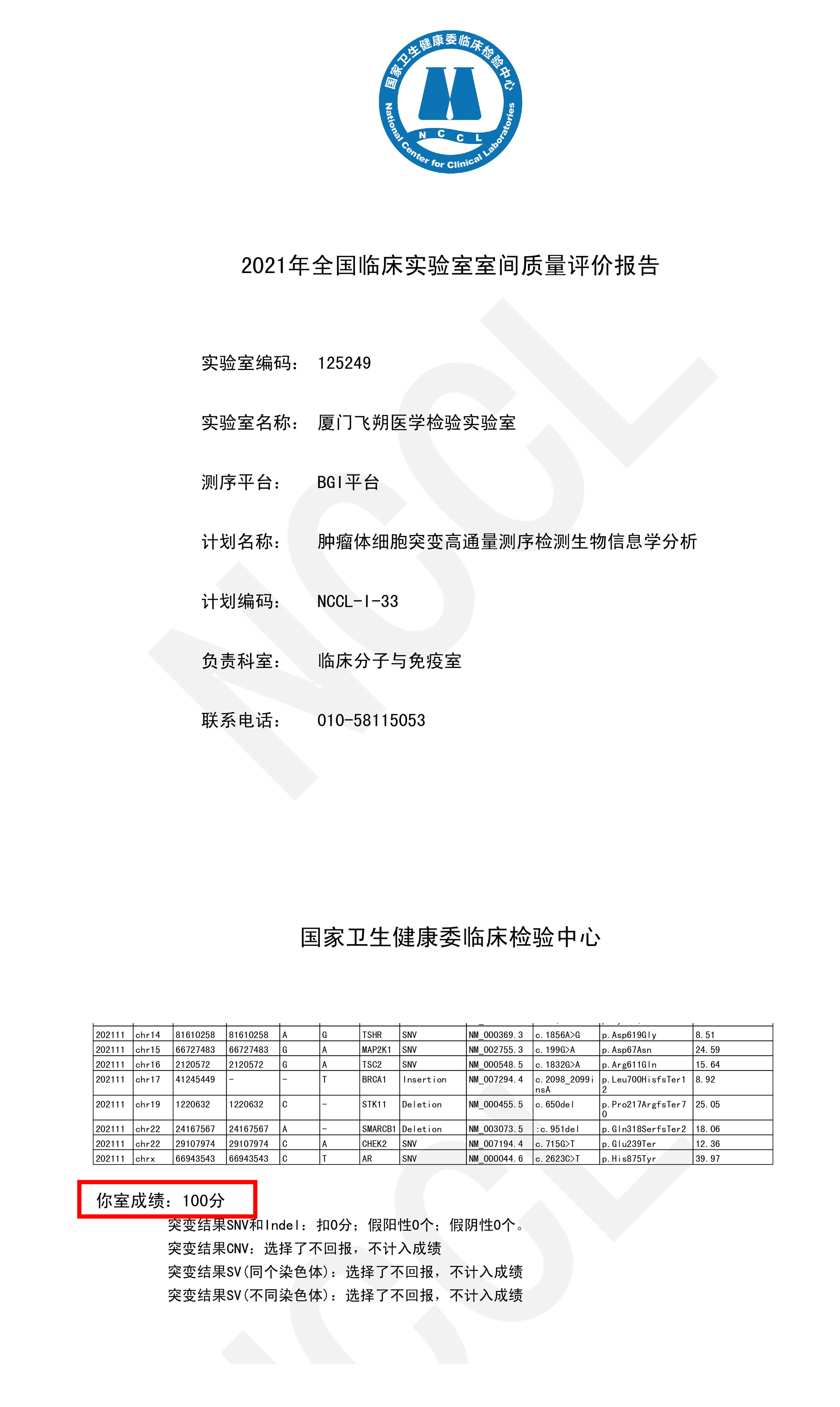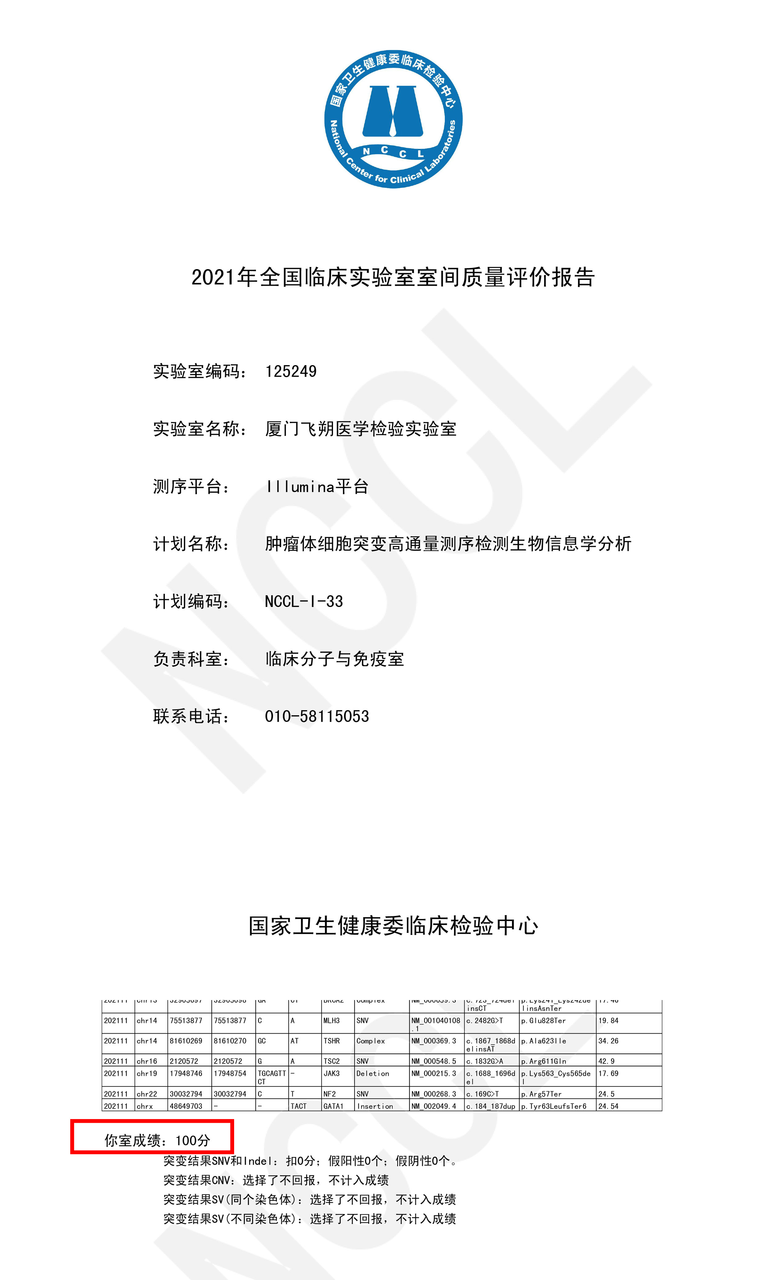 飞朔生物又双叒满分通过NCCL室间质评