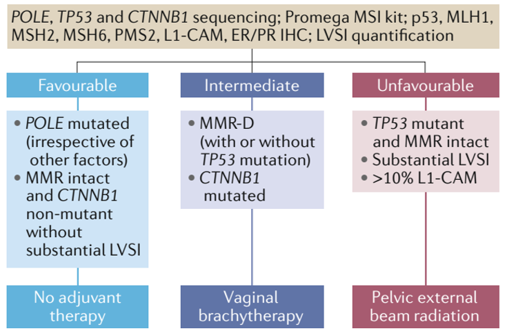 2. I~II期POLE突变的内膜样癌,术后不推荐进行辅助治疗;但III期以上的POLE突变的内膜样癌,其预后还缺乏证据[9]。