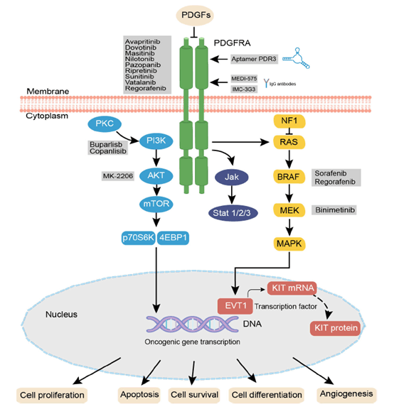 图2 PDGFRA信号通路及目前应用治疗策略