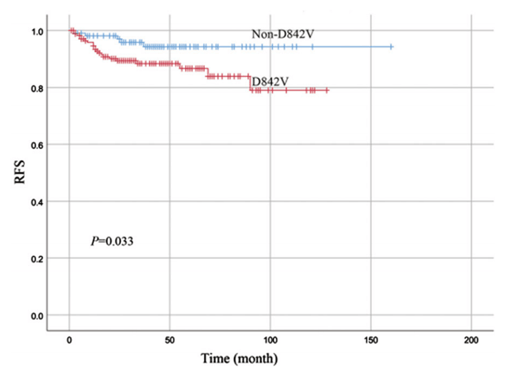有研究者对PDGFRA突变GIST患者中D842V突变型及非D842V突变型患者的预后差异性进行探索[15],研究入组280例PDGFRA突变患者包括172例(61.4%)D842V突变型和108例(38.6%)非D842V突变型。研究发现, D842V突变患者的1年、3年、5年RFS率分别为94.6%、88.3%和86.6%,非D842V突变患者的1年、3年、5年RFS率分别为98.1%、95.8%和94.3%。非D842V突变型患者的预后较好(P=0.033)。