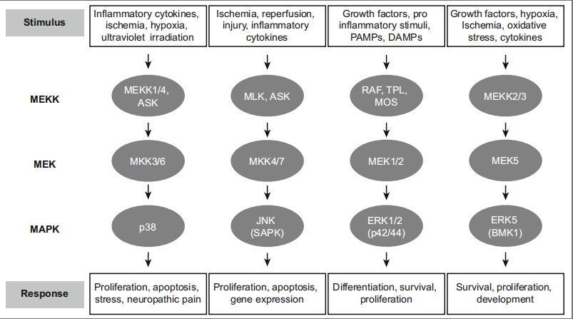 MAPK是一组丝氨酸/苏氨酸蛋白激酶,可接受细胞外的多种刺激的信号而被激活,从而调控着细胞增殖、分化、转化、炎症反应和凋亡等生理功能[1]。