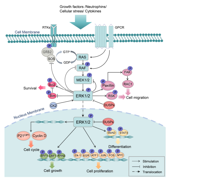 ERK/MAPK信号通路由Ras-Raf-MEK-ERK组成。当激素、生长因子、细胞因子等配体与受体酪氨酸激酶(RTK)结合后,该信号通路被激活,随后通过级联磷酸化反应传递信号。磷酸化的RTK将GRB2-SOS复合物募集到细胞膜,随后把与Ras结合的GDP转换为GTP,Ras转变为活性状态,进而招募Raf到细胞膜上,并使其磷酸化激活。活化的Raf进一步磷酸化并激活MEK1/2,使得ERK1/2被磷酸化并转移到细胞核内,调控转录因子的活性,从而影响细胞生长和凋亡等基因转录(图2)[3]。