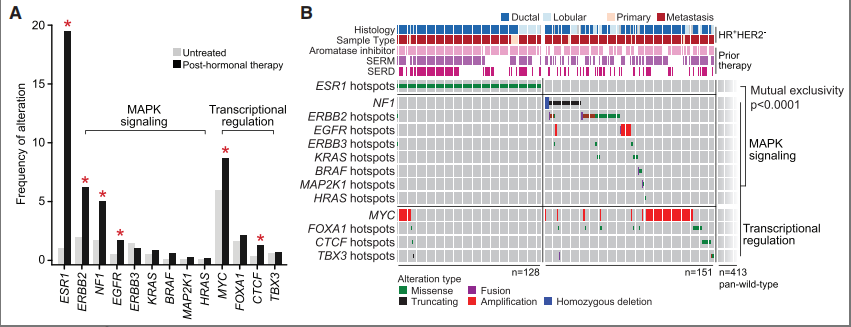 MAPK信号通路相关分子的突变是肿瘤发生的重要基因组事件,常见的基因有KRAS/NRAS/ HRAS、BRAF、MAP2K1(编码MEK1的基因)、NF1等。虽然这些基因在许多癌症类型中经常发生突变,但在原发性乳腺癌中却很少发生突变,主要发生在转移性乳腺癌中,且与内分泌治疗耐药密切相关。一项单中心前瞻研究(NCT01775072)对内分泌治疗耐药晚期乳腺癌样本进行基因组分析,发现由于MAPK信号通路相关基因突变而导致的内分泌治疗耐药占所有耐药因素的13%。其中,HER2基因突变和NF1基因突变增加两倍,其它MAPK信号通路基因(EGFR、KRAS等)突变也显著增加(图3)[4]。
