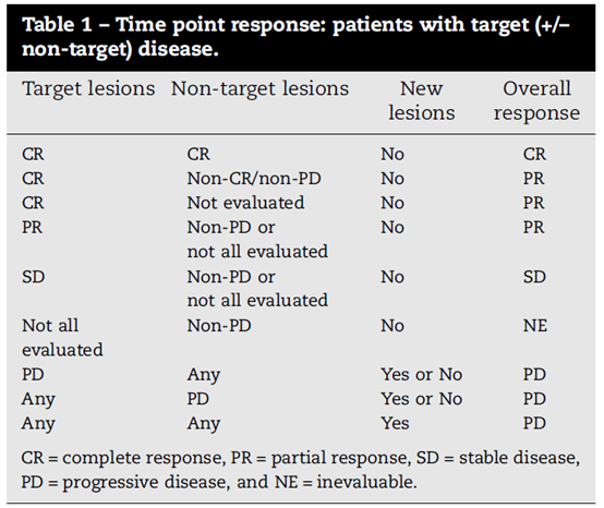 CR(完全缓解):所有非靶病灶消失或肿瘤标志物水平正常。所有淋巴结大小必须正常(短轴<10 mm)。