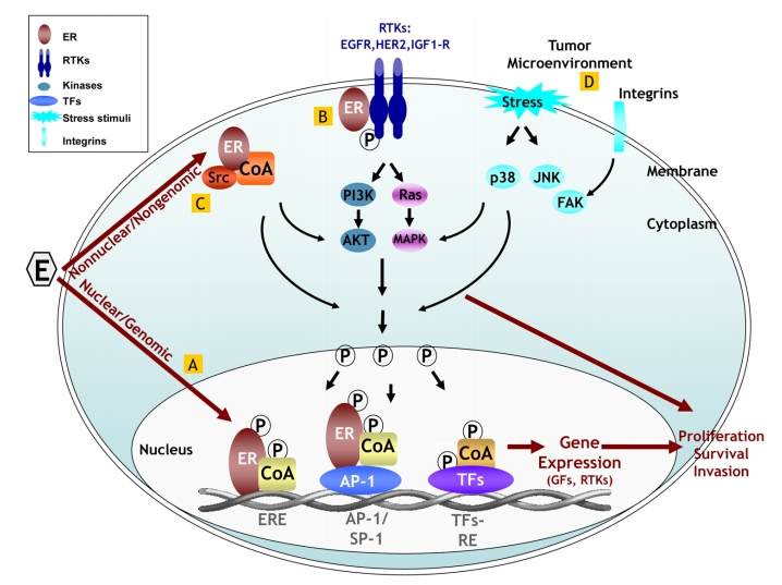 ESR1基因编码ER蛋白,是一种配体依赖性转录因子。ER通过细胞核内外两种路径发挥生理功能。在细胞核内,作为转录因子直接与雌激素反应元件(ERE,特定的DNA序列)结合,此时ER通常会募集共激活复合物(CoA),进而调控基因转录。在细胞核外,作为类似生长因子与RTKs(如EGFR、HER2、IGF1-R)及其它信号分子和共激活因子(如Src激酶)结合,进而可激活多种信号通路(如PI3K-AKT、MAPK),并磷酸化多种转录因子(TFs,如AP-1或NFκB)和共调控因子,进而调控基因转录。因此,当ESR1基因发生突变时,会导致ER功能发生异常,从而导致ER通路被异常激活,使得细胞异常转录和增殖,并逃避内分泌治疗药物的抑制作用。