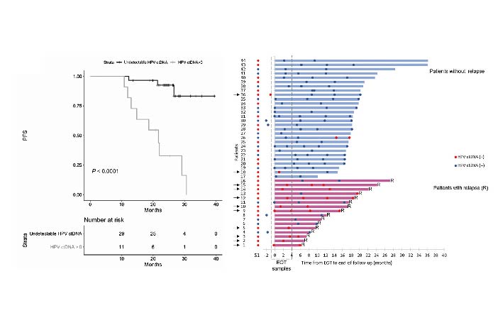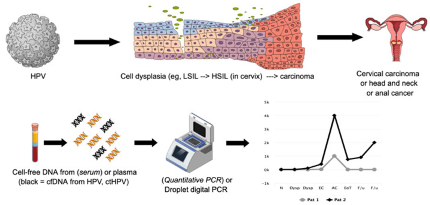 循环肿瘤DNA(ctDNA)是肿瘤组织、细胞等释放到循环系统中的肿瘤基因组片段,整合到宿主基因组中的HPV也以ctDNA的形式释放[3]。已有多部指南共识推荐ctDNA用于分子残留病灶(MRD)评估,ctHPV在总游离DNA中不受野生型背景的干扰,比点突变更容易检测和鉴别。