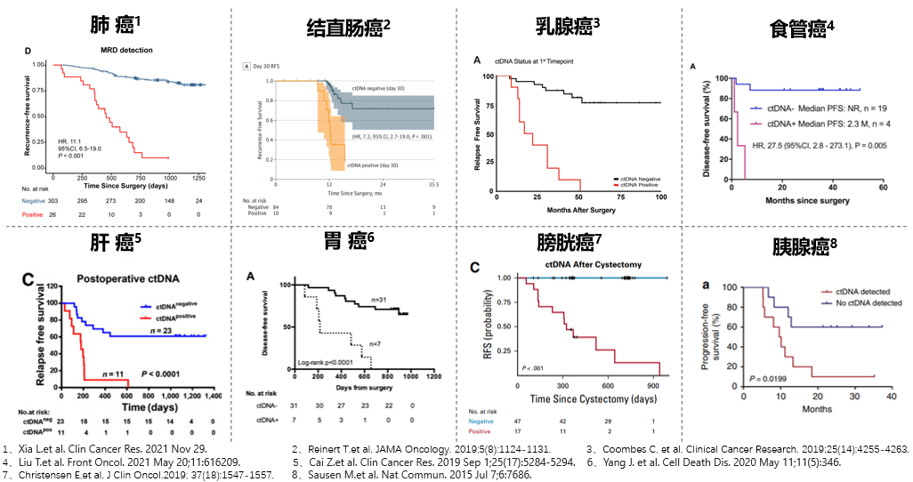 以上研究提示,与ctDNA阴性患者相比,ctDNA阳性患者的复发风险更高、预后更差。针对患者进行复发风险分层,将有助于指导个体化的随访和辅助治疗方案的制定。